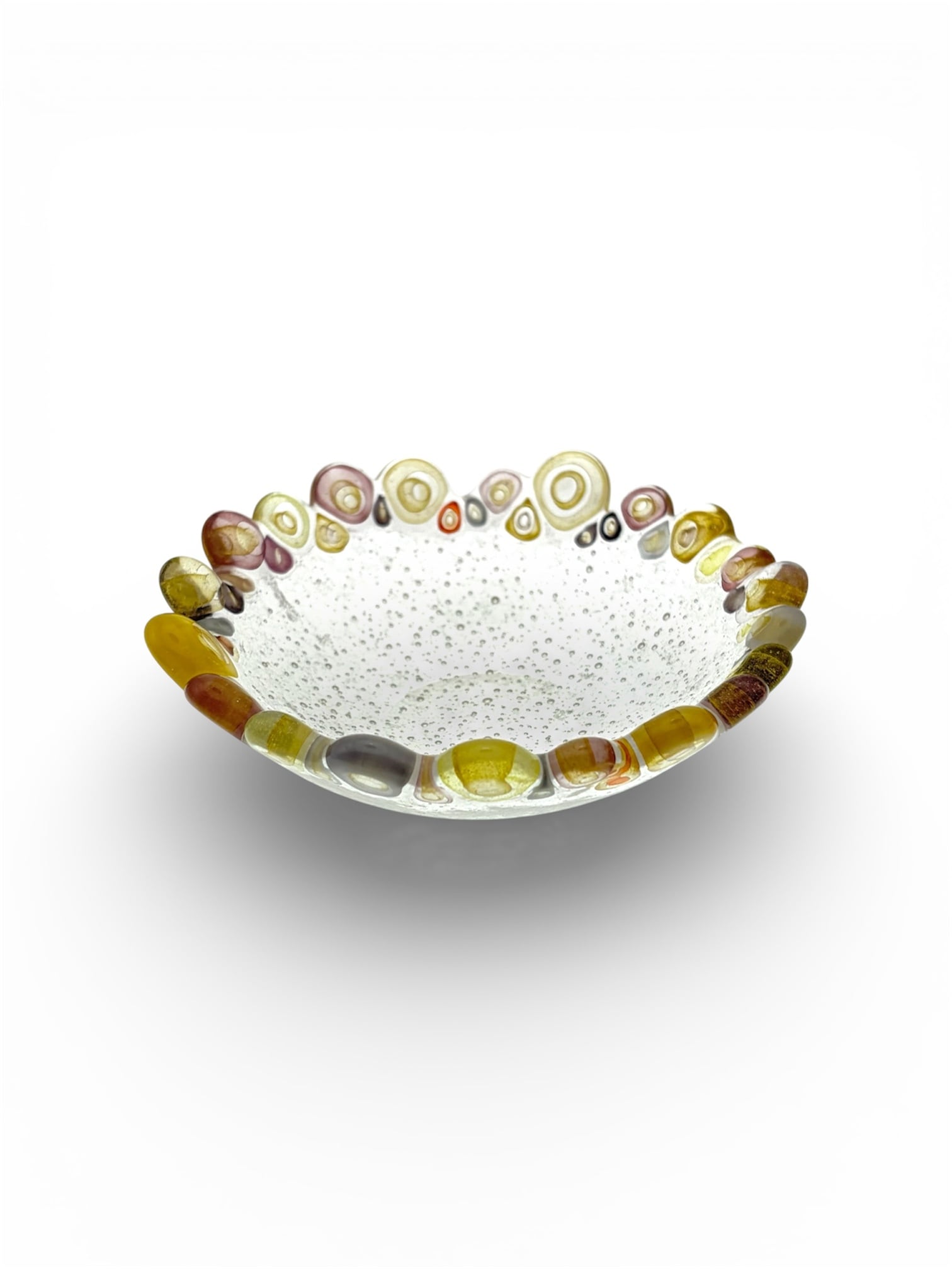 楽しい彩りで食卓を彩る、プリプリ感のあるキャンディボウル (黄・紫系)です!明るい黄色と優しい紫系の組み合わせが特徴で、どんなシーンでも目を引く華やかさを持っています。このキャンディボウルは、透明度の高いガラスを使用して丁寧に仕上げられており、丸みを帯びたデザインが愛らしさを演出します。