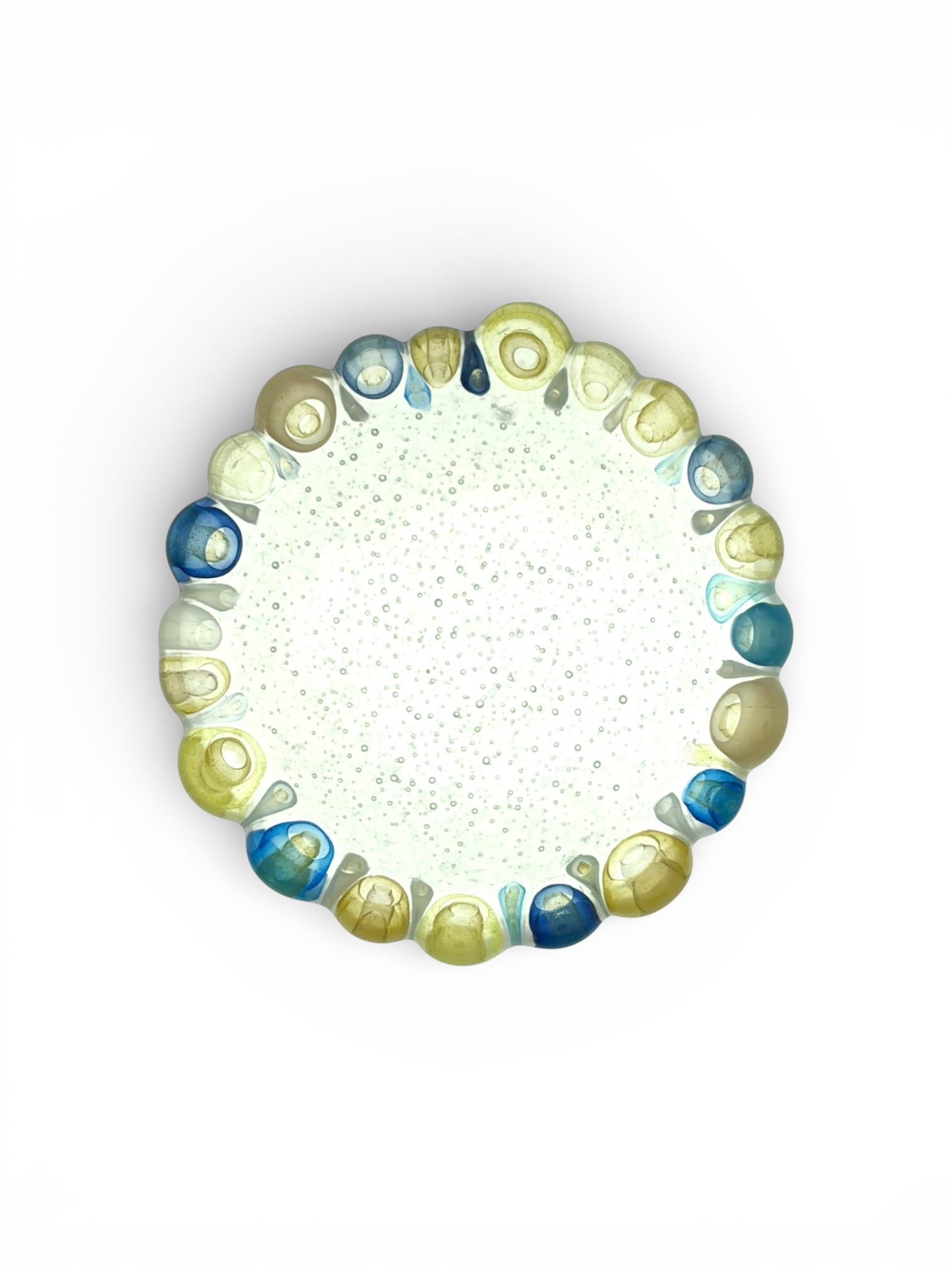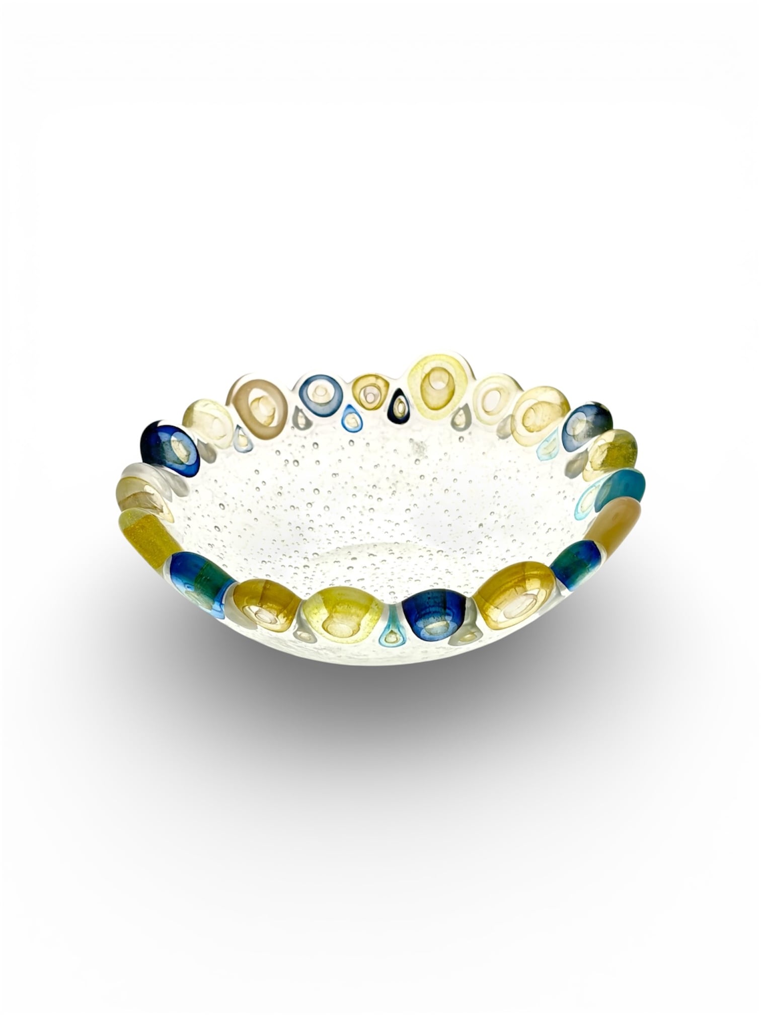 楽しい彩りで食卓を彩る、プリプリ感のあるキャンディボウル (青・黄系)です!鮮やかな青色と明るい黄色の組み合わせが特徴で、どんなシーンでも目を引く魅力を持っています。このキャンディボウルは、透明感のあるガラスを使用して丁寧に仕上げられており、ガラスの粒と粒の間に生まれる気泡も印象的な器です。