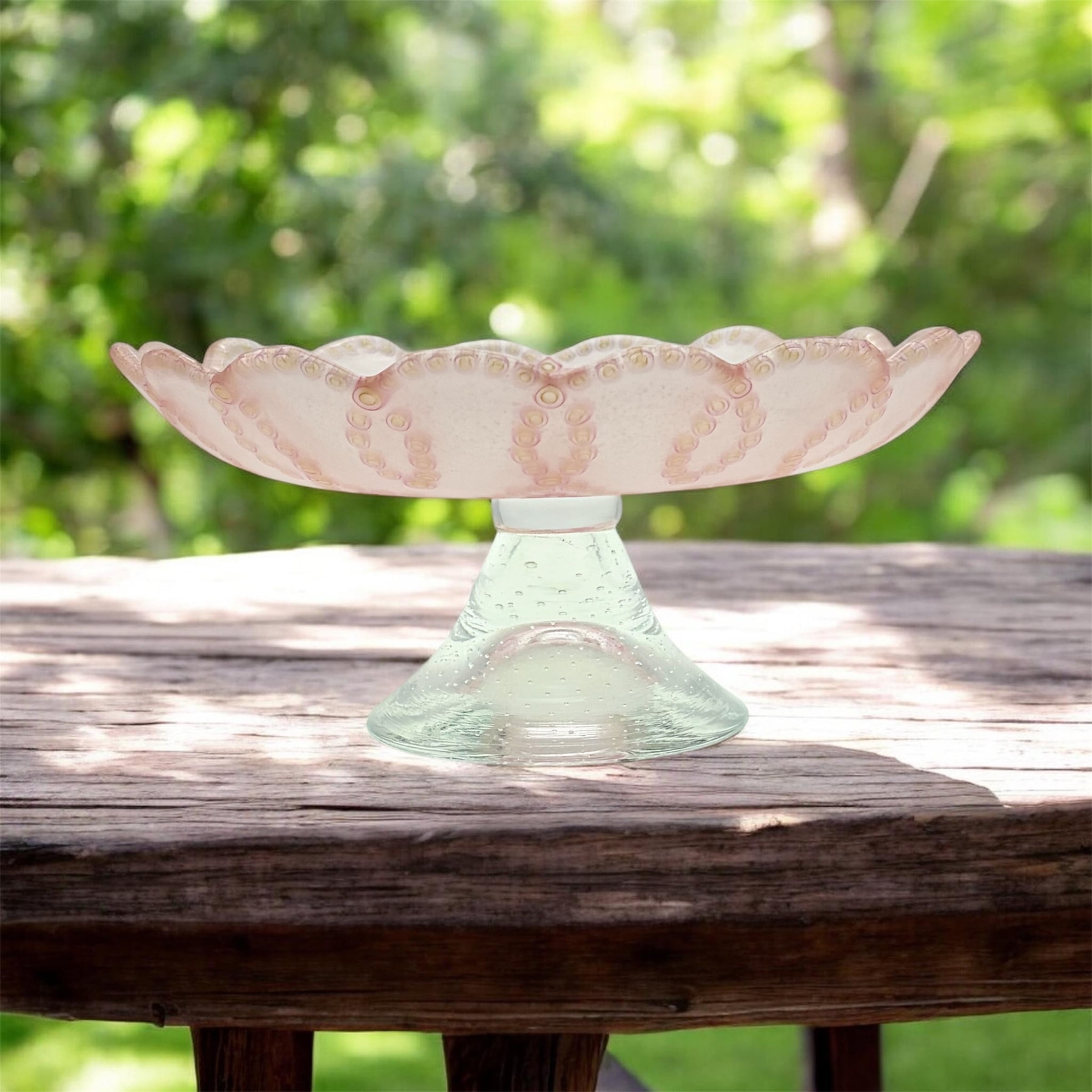 優しいピンクカラーが魅力的な、キャンディコンポート (ピンク)が登場です!当工房オリジナルのキャンディボウルの、細かいガラスパーツを繊細に全面配置し、美しい曲線を描いたフラワーデザインが特徴です。食卓やカウンターを一層おしゃれに演出します。このコンポートは、クリアなガラスを使用して丁寧に仕上げられており、さまざまなお菓子やフルーツをスタイリッシュに盛り付けることができます。