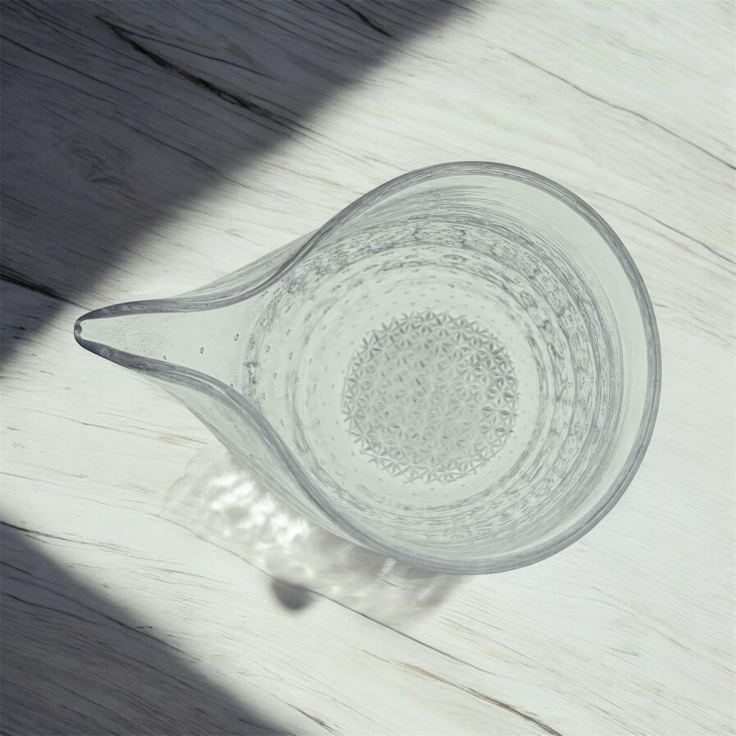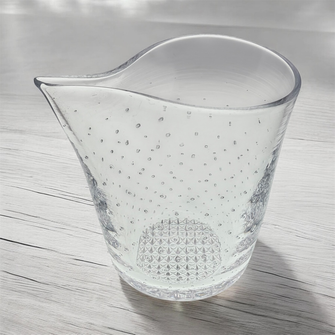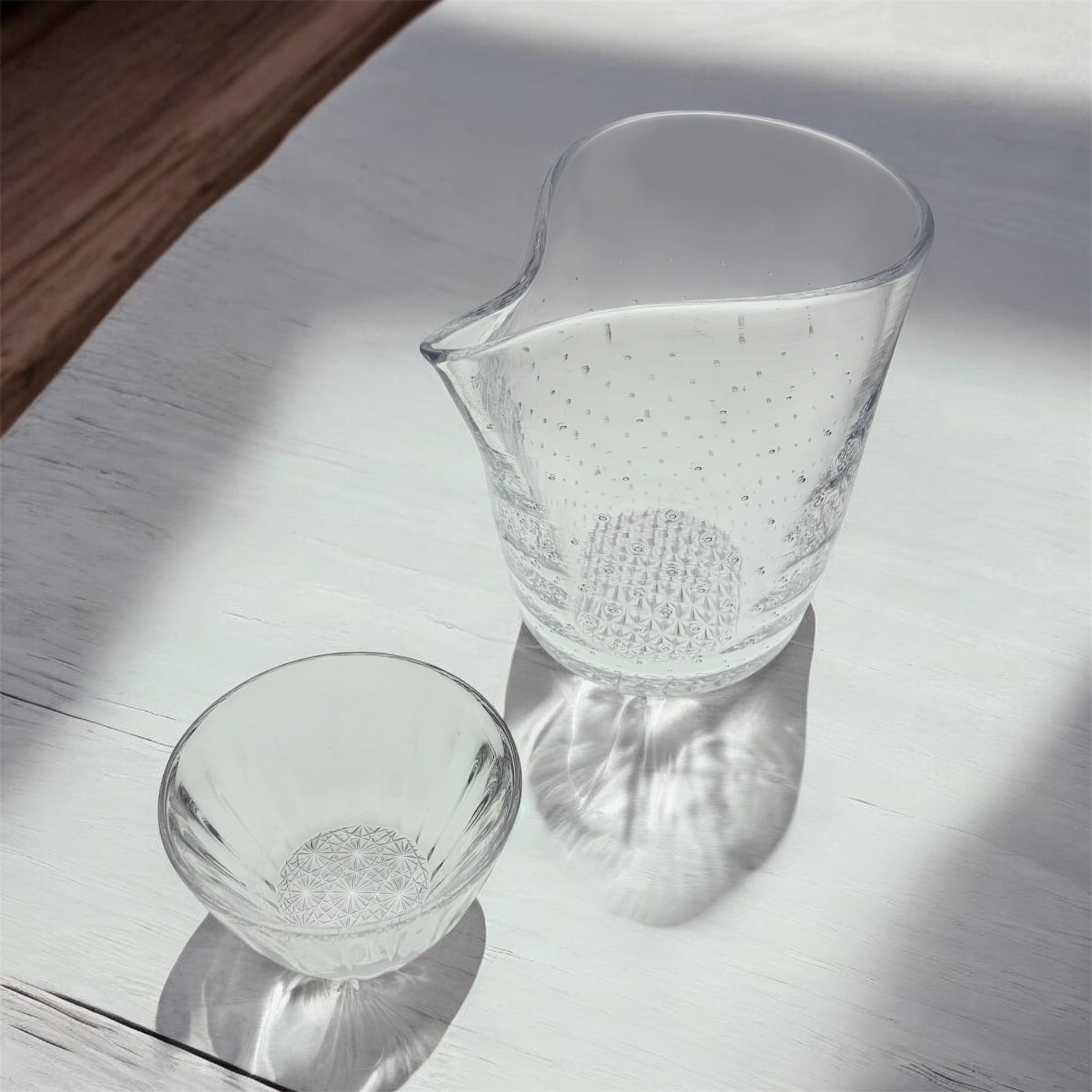 2種類の型を使用した型吹き技法で制作した片口と猪口の底部分には、麻の葉や菊繋ぎ模様の切子を施してありキラキラと輝くので、お好きなお酒を注ぐだけで特別な雰囲気が漂います。友達や大切な方との飲み会、あるいは一人のリラックスタイムにも最適です。普段の晩酌が、より一層楽しいものになること間違いなし!
