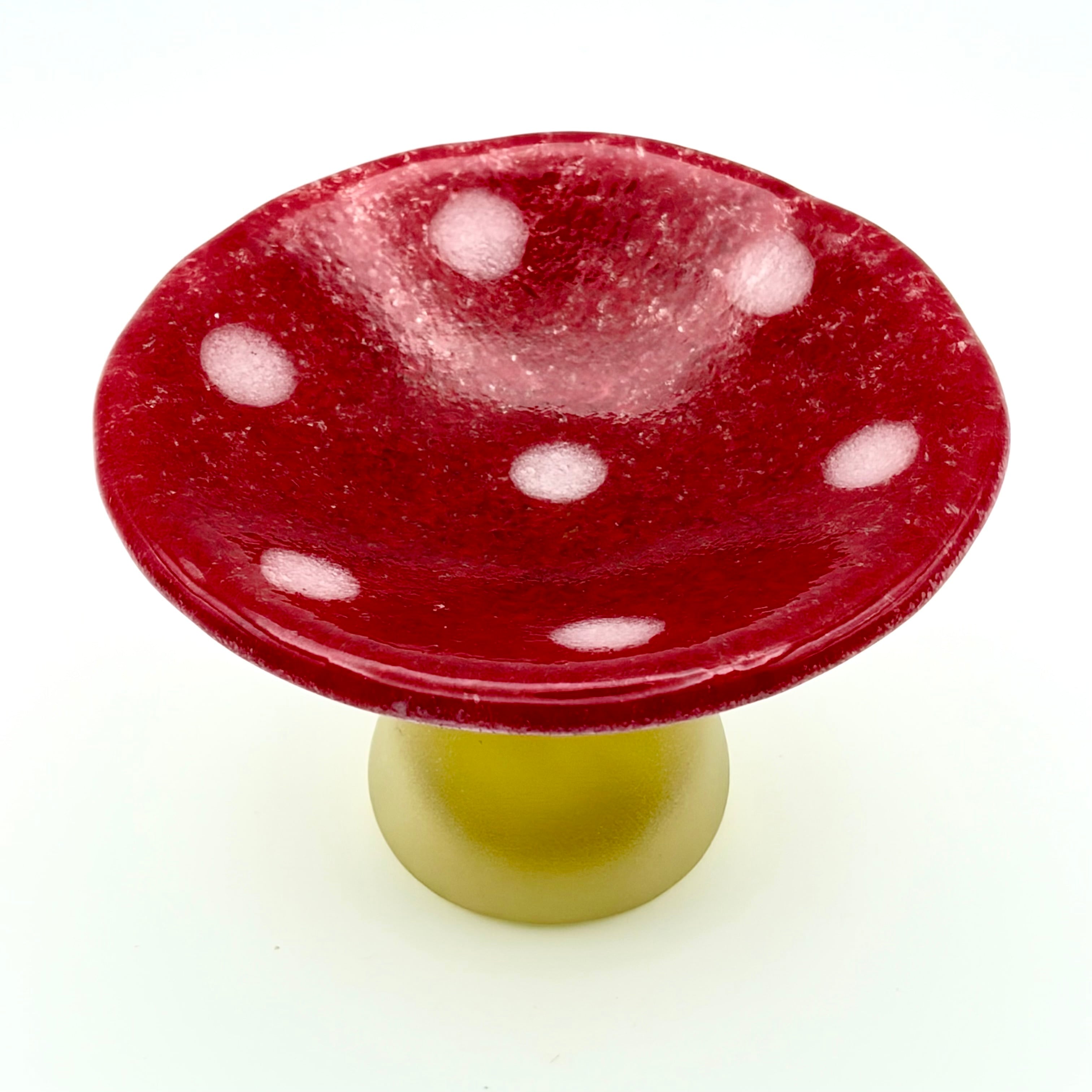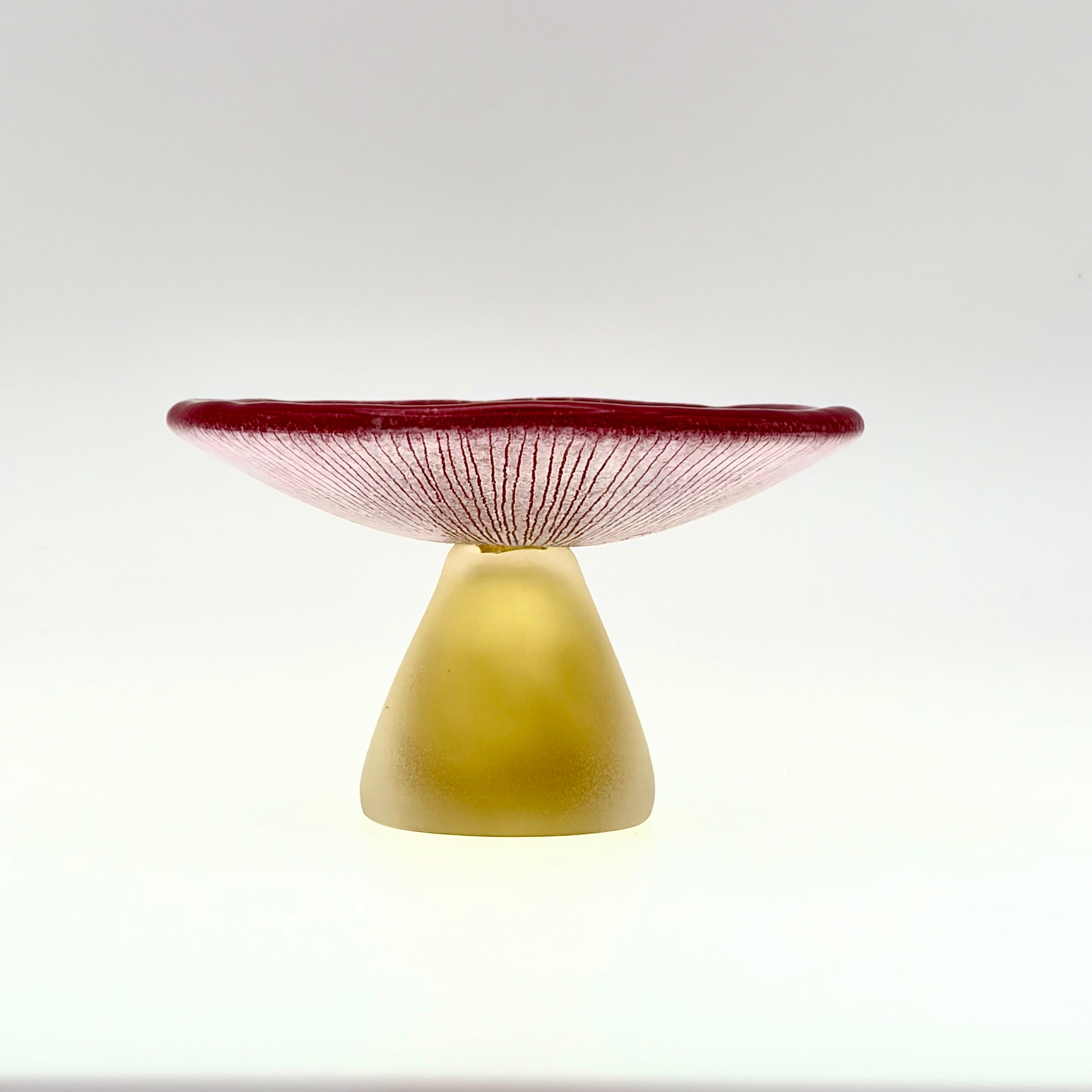 このキノコ皿は、吹きガラス技法とキルン技法を用いて作られており、ちょっとしたおつまみ等を盛り付ける際、キュートなアクセントを加えてくれます。もちろん、食卓以外でもアクセサリー等の小物を乗せる器としてもお使い頂けます。